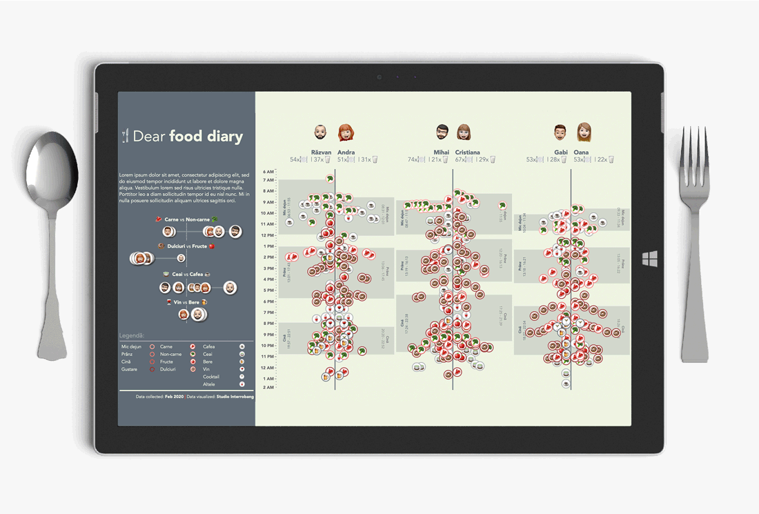 At its core, it visualized our food patterns over ten days. But it is as much about the data visualization output as it is about the process behind its collection and how important participation was to foster curiosity about the final output. We wanted an easy way to collect the data. This is why we crated an Apple Shared Album where everyone posted a picture of everything they ate or drank during each day at the time it happened. This rapidly became a proto-version of the BeReal app, and everyone eagerly awaited one another's posts and comments. The entire process was so engaging that it was very hard to stop after just ten days.